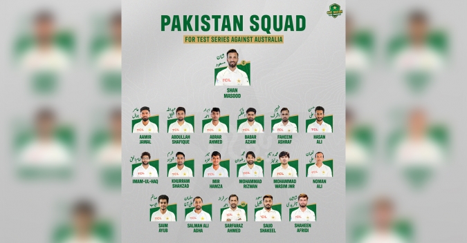 Pakistan squad for Australia Tests: Shan Masood (captain), Aamir Jamal, Abdullah Shafique, Abrar Ahmed, Babar Azam, Faheem Ashraf, Hasan Ali, Imam-ul-Haq, Khurram Shahzad, Mir Hamza, Mohammad Rizwan (wk), Mohammad Wasim Jnr, Noman Ali, Saim Ayub, Salman Ali Agha, Sarfaraz Ahmed (wk), Saud Shakeel and Shaheen Shah Afridi